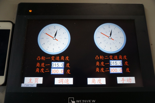 上图显示的是凸轮分段控制,12到黑针之间对应的凸轮从原点到封口轮碰到桶边的位置,黑针和红针之间对应的是卷边位置,红针到12对应的是卷边完毕后到凸轮归原位的位置。