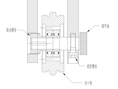 调节封口轮前后位置时,只需将锁紧螺栓松开转动调节轴,调整完毕后推紧调节轴上紧锁紧螺栓即可,更换一套压轮只需十分钟左右。