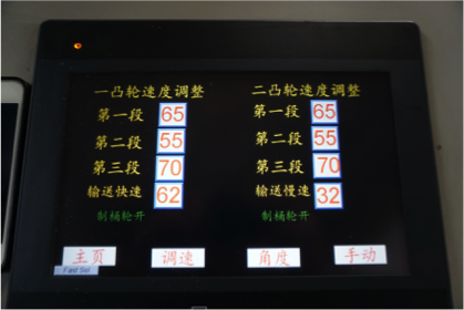 我公司经过多年的研究和攻关,近期已研制成功了封口轮进给机构PLC程序化控制和进给参数人机对话触屏控制。实现了操作人员根据实际运行状态对封口过程进行有效掌控,可使卷边结构更加合理,同时在产品切换时,封口轮位置调整更加高效,设备效率大大提高。解决原凸轮机械结构进给时间曲线无法调节,封口轮位置调整工人爬上爬下耗时又不安全等几大困扰问题。是制桶设备的一次重大革新。